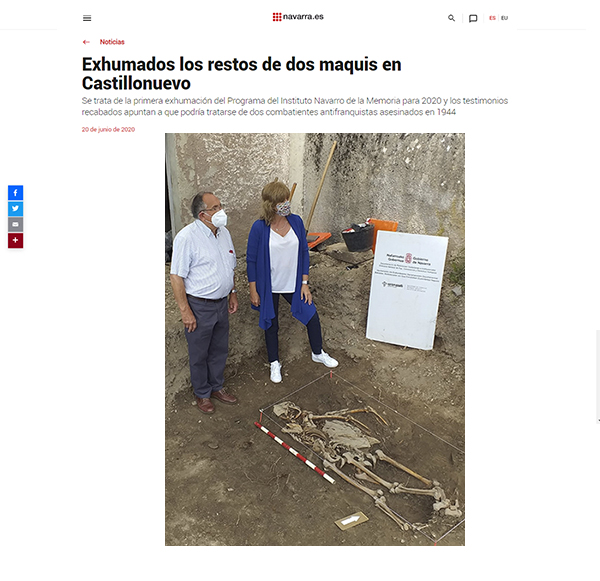 ![]() Instituto Navarro de la Memoria Exhumados los restos de dos maquis en Castillonuevo. Se trata de la primera exhumación desarrollada en el marco del Programa de Exhumaciones del 2020. Enlace web ![]() | |