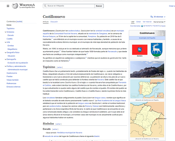 | Las informaciones expresadas en la presente publicación son las de los autores. ![]() Vive tu pueblo: El milagro de la subsistencia! Un viaje por esos pueblos que languidecen, orgullosos de conservar en su memoria las esencias fundamentales de nuestra Historia. Paisajes yermos de futuro, el silencio de sus calles vacías, una belleza que duele, cautiva y se engancha a la piel del visitante. La resignada mirada de los que esperan y también exigen, cambiar un día su oscuro destino por el respeto y la atención que merecen. Enlace web a videos ![]() ![]() El Visor de Toponimia Oficial de Navarra, una herramienta que posibilita consultar la base de datos de toponimia oficial a través de un visor geográfico moderno. La importancia de los topónimos de un lugar está en que nos ofrece una información muy valiosa de la vida de las personas que han habitado en ese espacio y hasta muchas veces nos hablan de las personas mismas. Enlace web visor toponimia ![]() Castillonuevo en la Gran Enciclopedia Navarra. Fundación Bancaria Caja Navarra. Enlace web ![]() | |